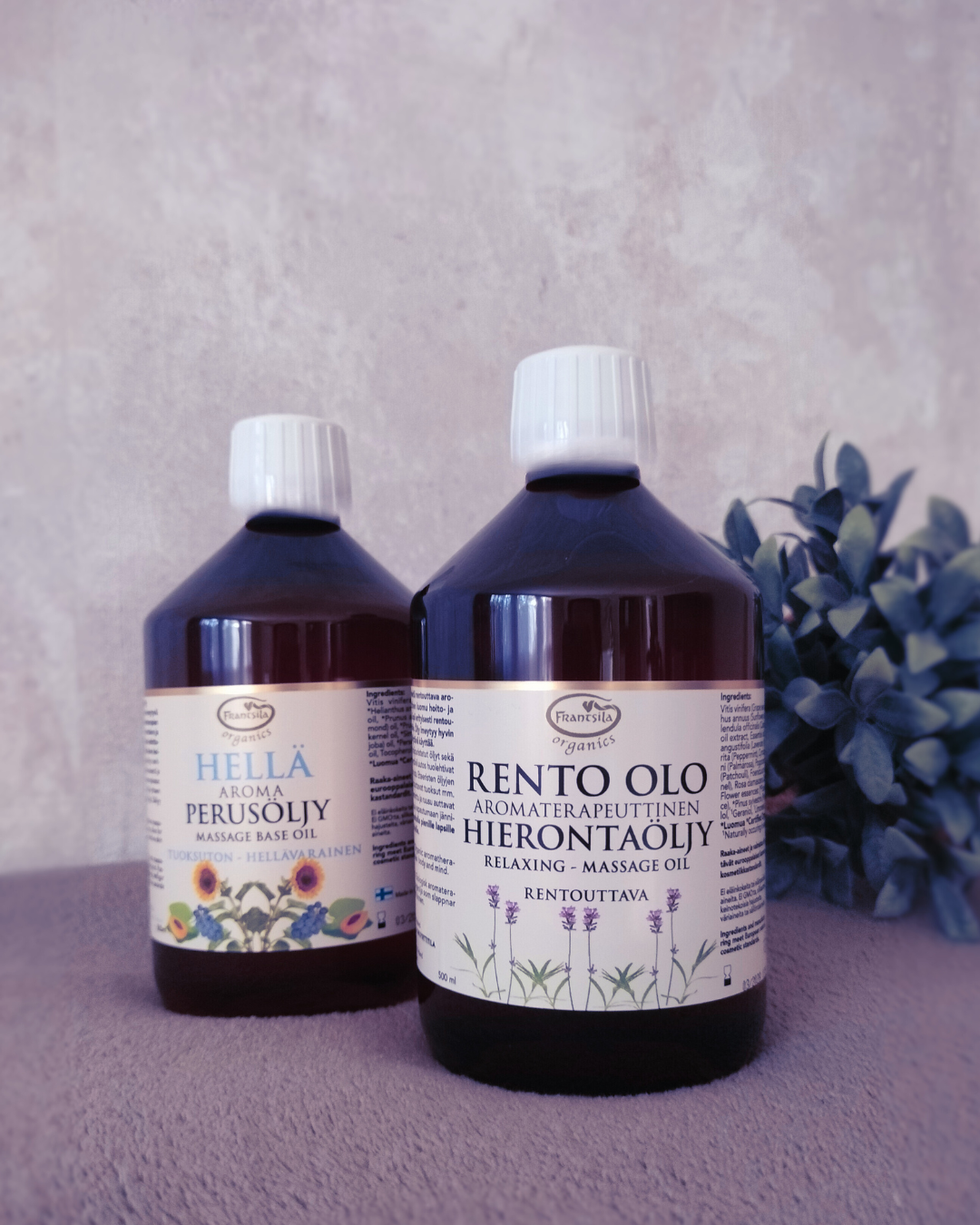 Hoidoissa käytettävät öljyt ja voiteet ovat kotimaisia, laadukkaita luonnontuotteita.